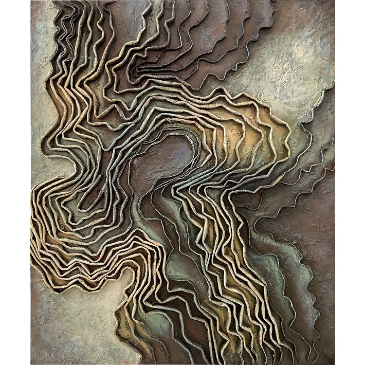 In golvende bewegingen lijken deze 3D onderdelen langs elkaar heen te gaan. De kleuren zijn antraciet, grijs, geel en groen in warme rustige tinten. In tegenstelling tot de varianten op canvas, creëert dit schilderij met zijn 3D-effecten een indruk van ruimtelijke diepte.