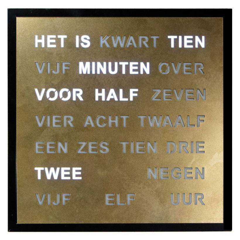 Deze woordklok is een opvallende wandklok die de tijd op een andere manier aangeeft. Niet traditioneel met wijzers, maar met woorden. Elke 5 minuten lichten er woorden op waarmee afgelezen kan worden wat de juiste tijd is. Een even simpel als ingenieus idee. Vindingrijk uitgevoerd in een vierkant LED scherm met wit oplichtende woorden die zijn in te stellen op 3 lichtsterktes. De klok werkt op netstroom en is voorzien van een zwart snoer met een 12Volt stekker adapter. Het front van dit model is in antiek goud uitgevoerd. Hierdoor oogt dit model duur en krijgt het een chique uitstraling.