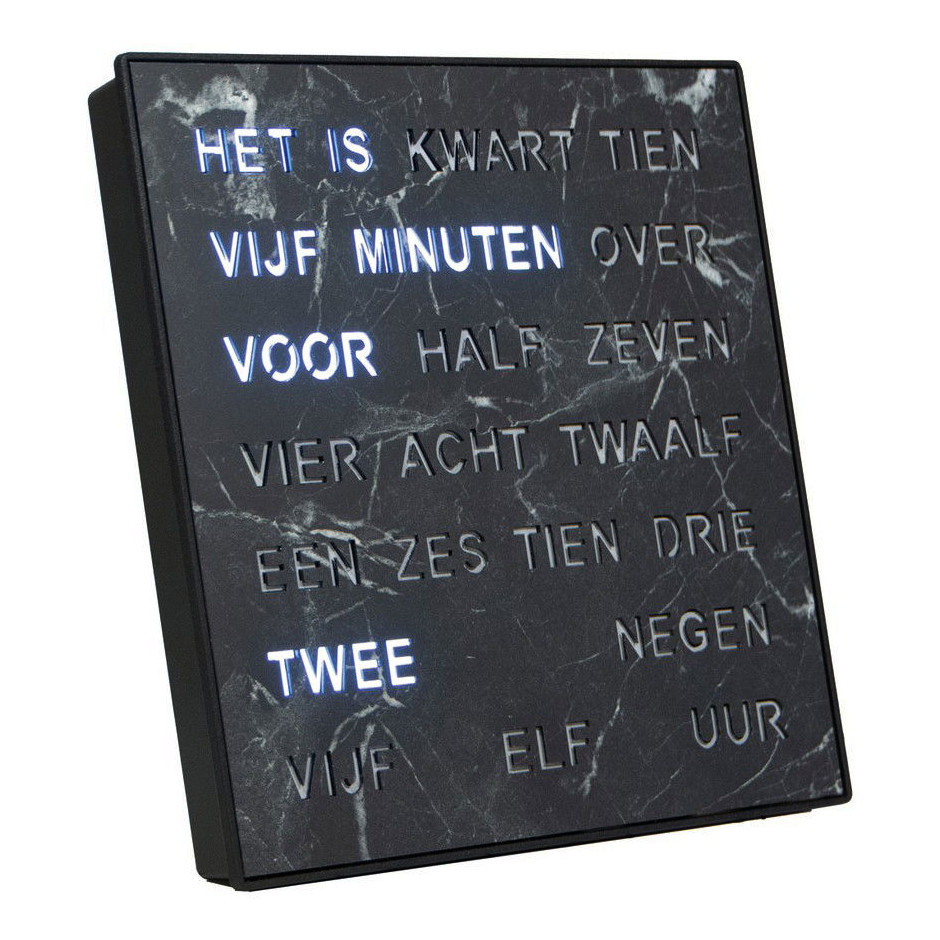 Deze woordklok is een opvallende klok die de tijd op een andere manier aangeeft. Niet traditioneel met wijzers, maar met woorden. Elke 5 minuten lichten er woorden op waarmee afgelezen kan worden wat de juiste tijd is. Een even simpel als ingenieus idee. Vindingrijk uitgevoerd in een vierkant LED scherm met wit oplichtende woorden die zijn in te stellen op 3 lichtsterktes. De klok werkt op netstroom. Het front van dit model is uitgevoerd in een zwart marmer motief. Een toevalstechniek die er voor zorgt dat elk model net weer even anders is.