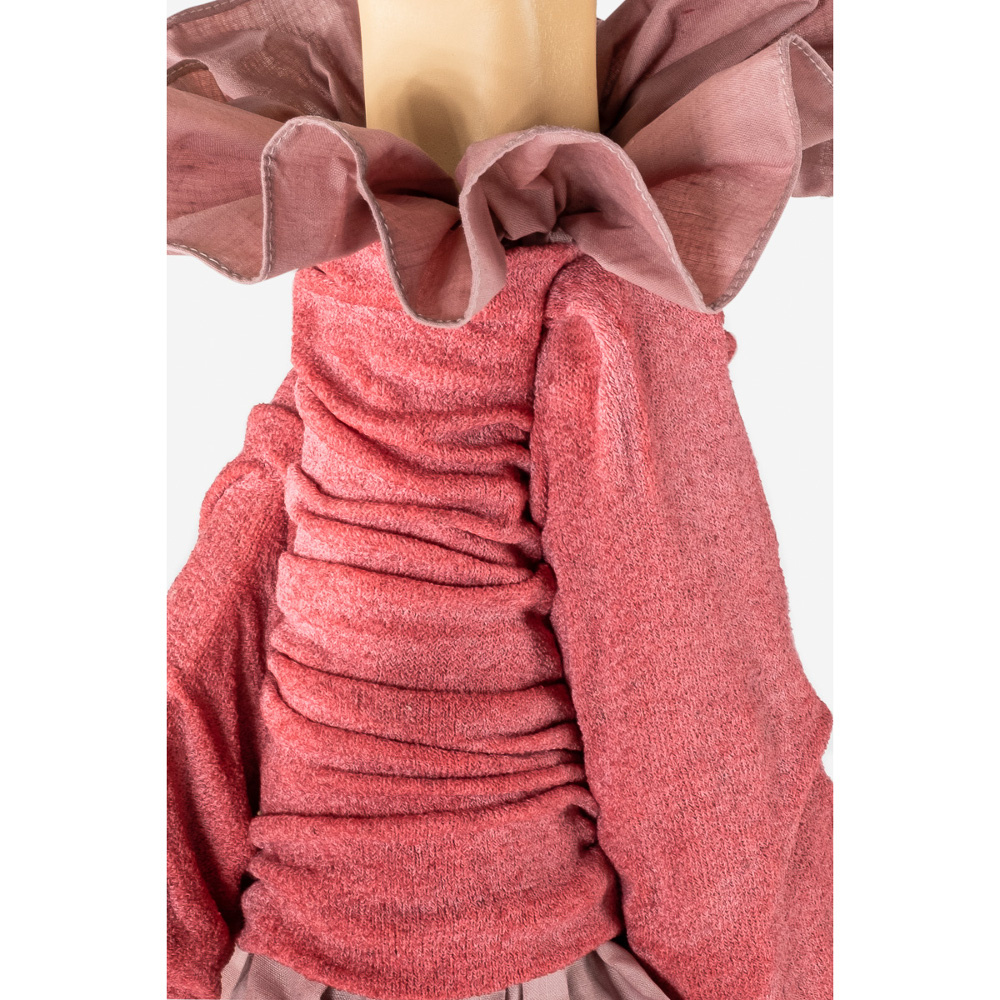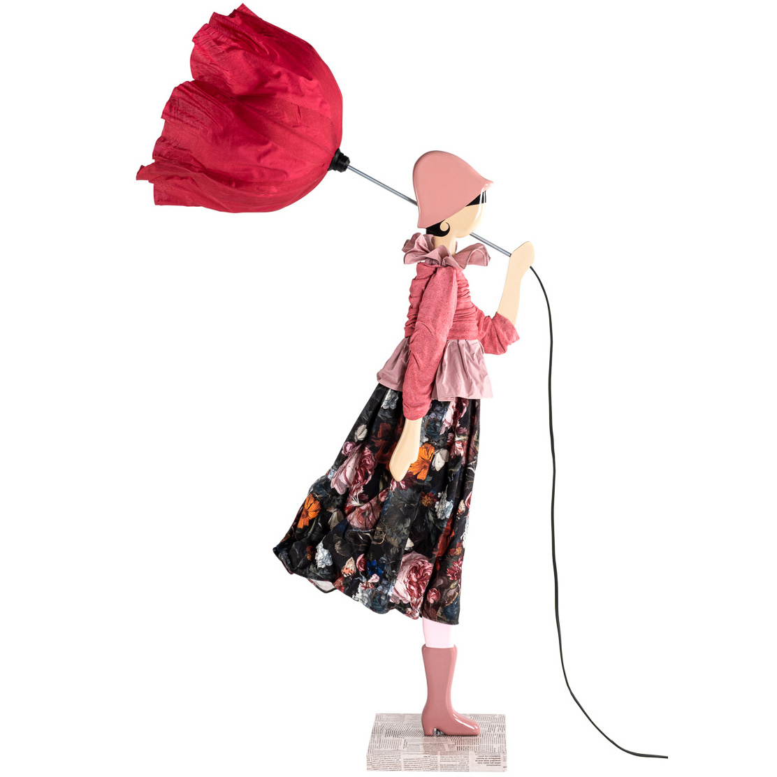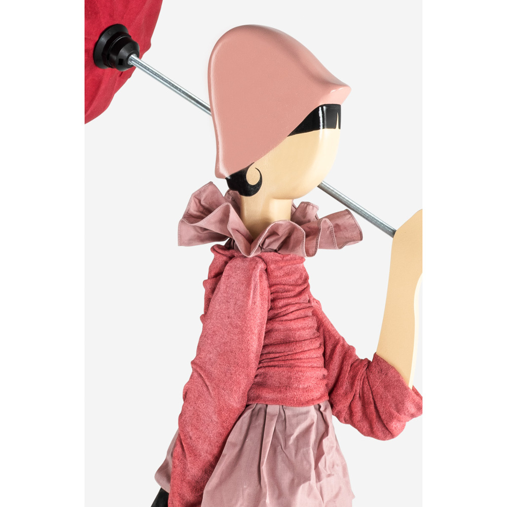 De donkerrode bloemparaplu dient als lampenkap en is gemaakt van nikkelkleurig metaal met gedeeltelijk opgestijfd kaasdoek. De basis van de vrouw is gemaakt van beschilderd hout. Verder is Dicentra aangekleed met de mooiste stoffen, zoals een uitbundig geplooide blouse met daaroverheen een klein geplooid truitje. Beide in oudroze. Ze draagt dit ensemble op een donkere rok met een prachtig klassiek bloemmotief. Het in oudroze uitgevoerde bijpassende hoedje en de laarsjes zorgen voor de finishing touch. Voor de opgewaaide uitstraling zit er onderin de rok ijzerdraad verwerkt. De vierkante voet is van hout en beplakt met delen van Europese kranten. De lamp is voorzien van zwart elektriciteitssnoer met aan/uit schakelaar.